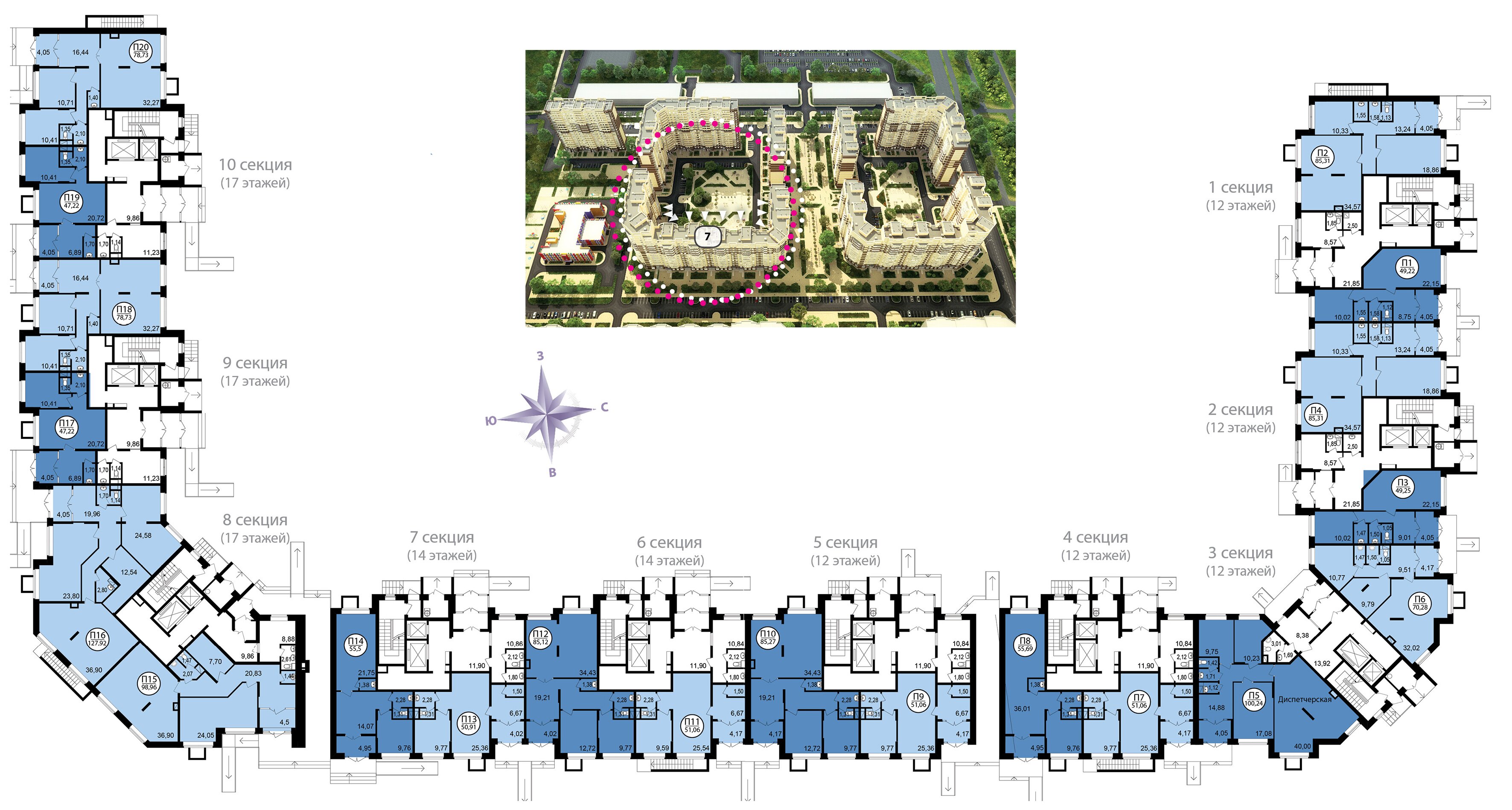 Площадь предлагаемых коммерческих помещений в 7-ом корпусе - от 47,22 до 127,92 кв. м.